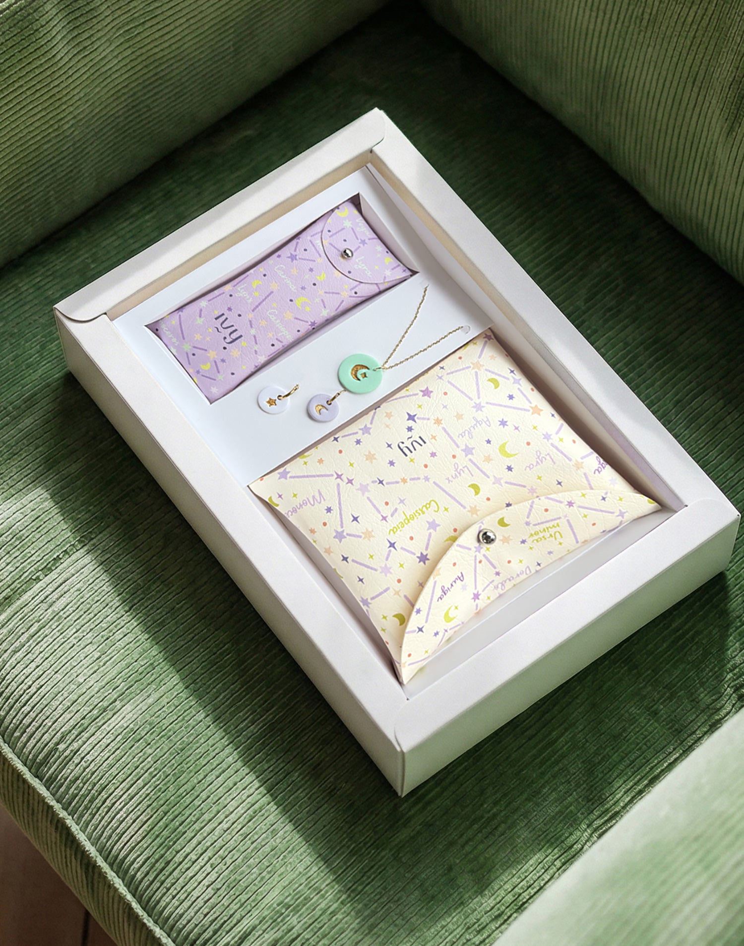 El Pack Constelaciones es una selección especial de accesorios pensada para acompañarte en tu día a día con color, suavidad y un aire artesanal. Un conjunto equilibrado entre diseño y funcionalidad, presentado en una caja cuidada al detalle, ideal para convertirlo en un regalo lleno de encanto.